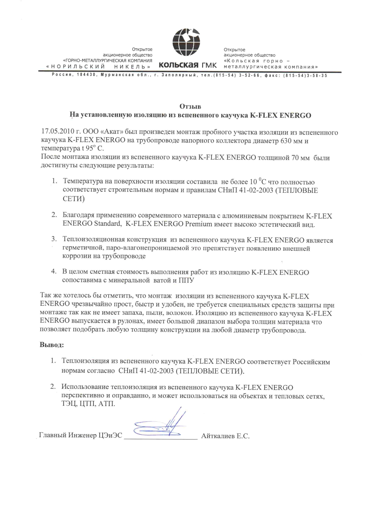 Отзыв АО «Кольская ГМК» (ПАО «ГМК «Норильский никель»). Выполнен пробный участок изоляцией из вспененного каучука K-FLEX ENERGO с защитным покрытием K-FLEX PREMIUM на трубопроводе напорного коллектора диаметр 630 мм. Температурой энергоносителя + 95 градусов С.