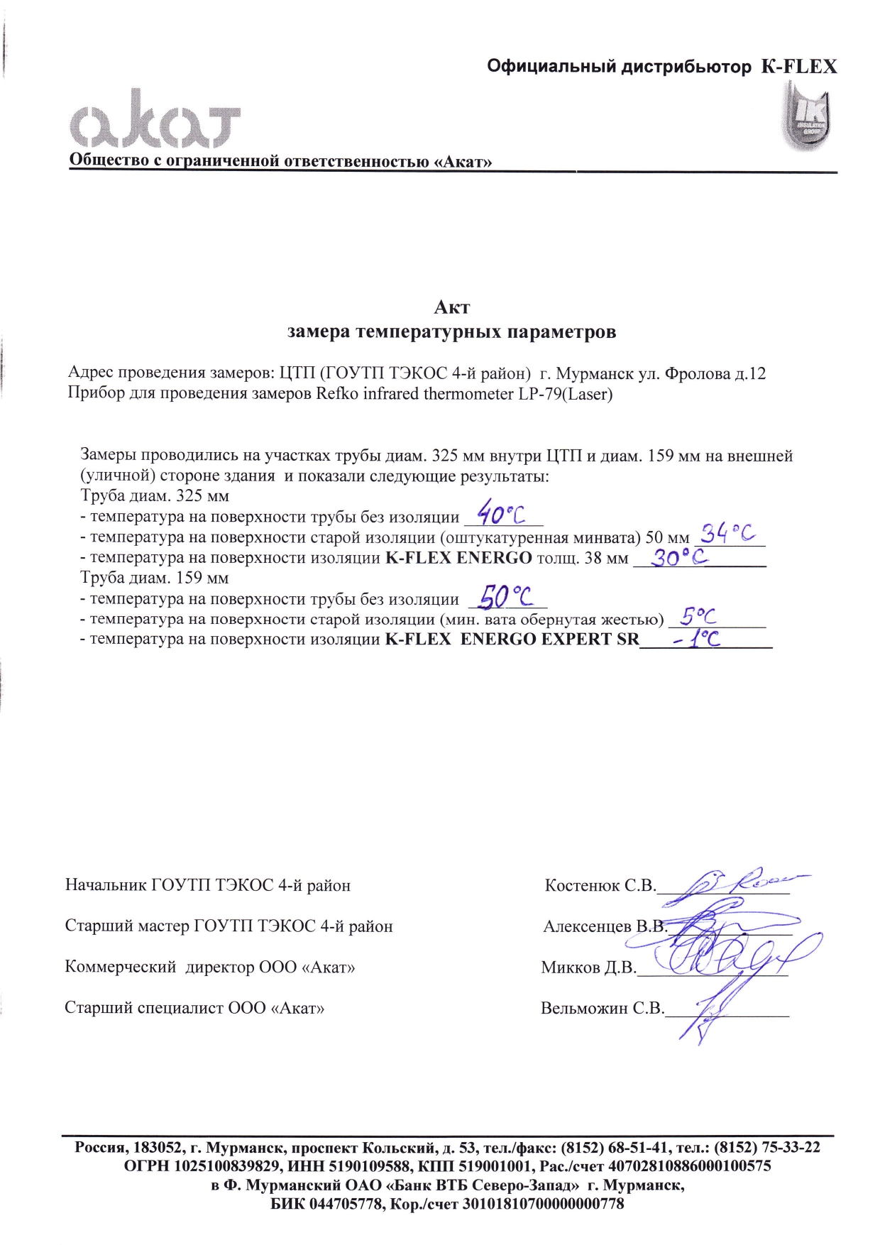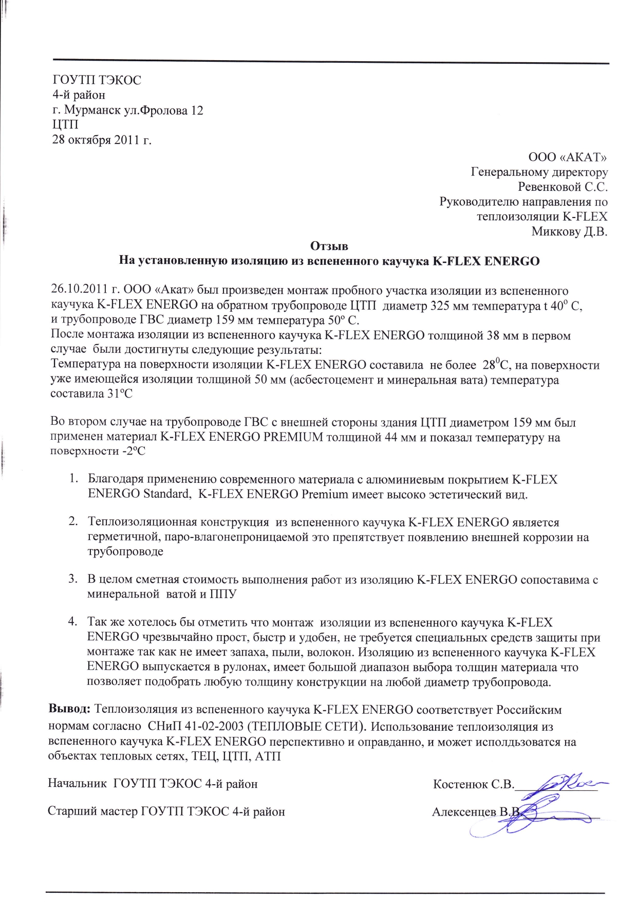 Отзыв ГОУТП «ТЭКОС» г. Мурманск. Был произведен монтаж пробного участка изоляцией из вспененного каучука K-FLEX ENERGO на обратном трубопроводе диаметр 325 мм и трубопроводе ГВС диаметр 159 мм.