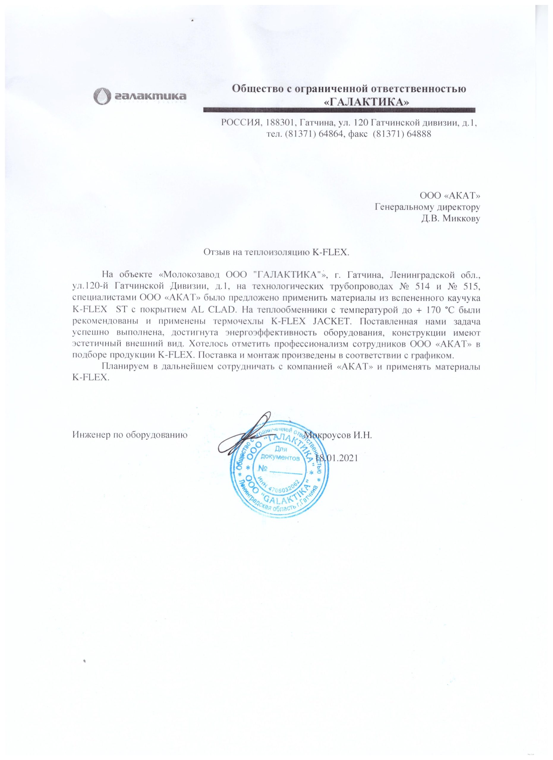 Отзыв «Молокозавод ООО «Галактика». Был выполнен монтаж изоляции технологических трубопроводов материалами K-FLEX ST с покрытием K–FLEX AL CLAD. Конструкция имеет высоко эстетический внешний вид и имеет высокую энергоэффективность.