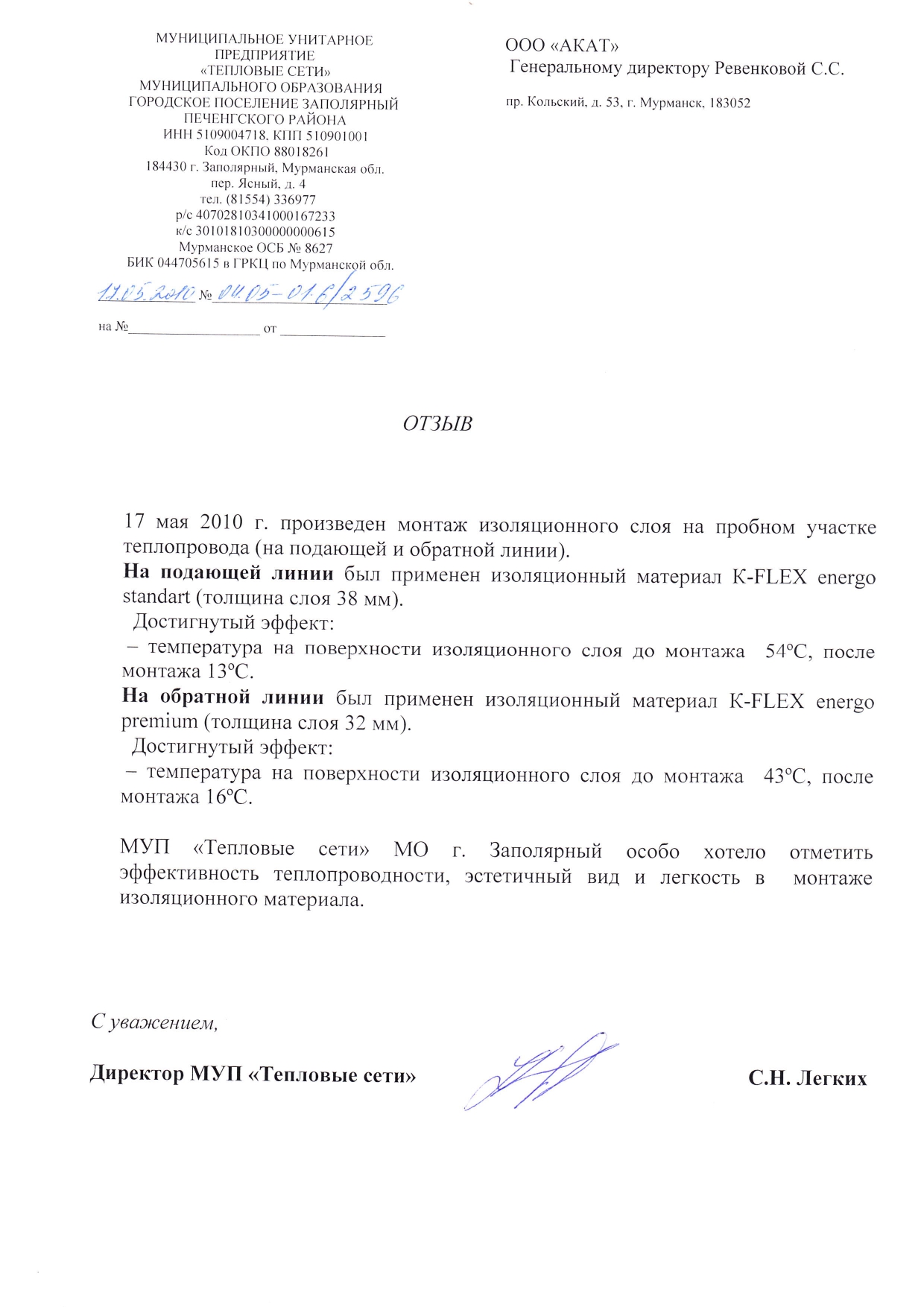 Отзыв МУП «Заполярные Тепловые Сети». Был произведен монтаж изоляционного слоя на пробном участке теплопровода (на подающей и обратной линии). на подающей линии был применен изоляционный материал k-FLEx епеrgо standart. МУП «Тепловые сети» МО г. Заполярный особо хотело отметить эффективность теплопроводности, эстетичный вид и легкость в монтаже изоляционного материала..