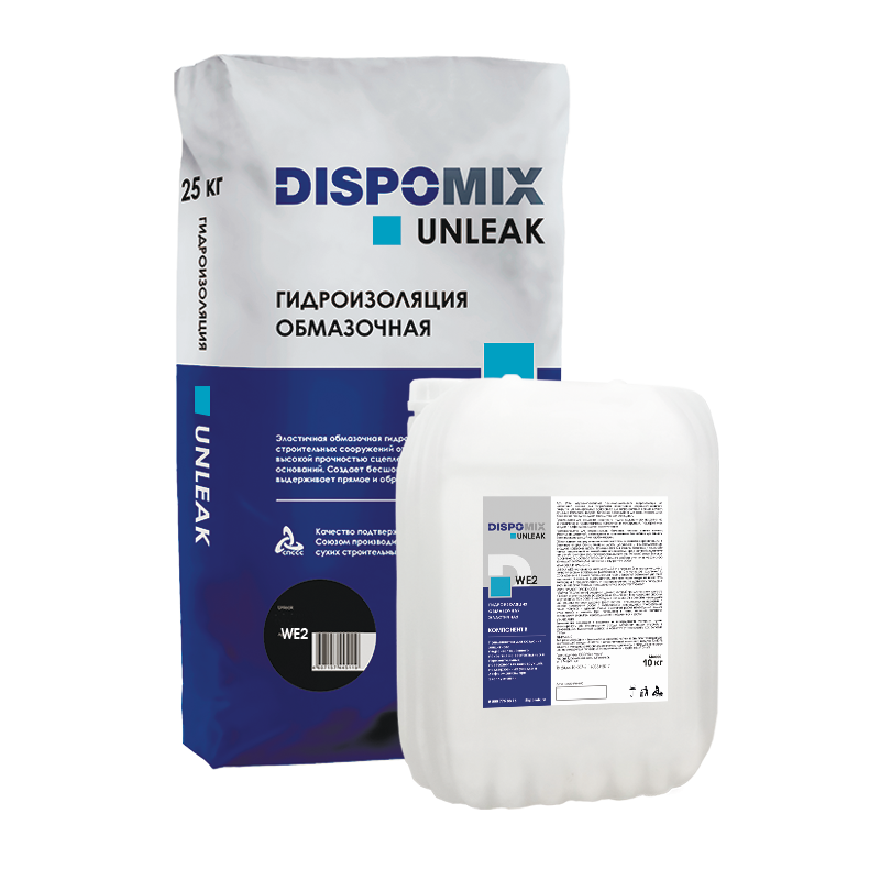 Гидроизоляция обмазочная эластичная Unleak WE2 35 кг — Двухкомпонентная полимерцементная гидроизоляция на цементной основе для устройства эластичного гидроизоляционного покрытия на минеральных основаниях для гидроизоляции ванных комнат, душевых, балконов, террас, бетонных резервуаров для воды, плавательных бассейнов перед укладкой керамической облицовки.